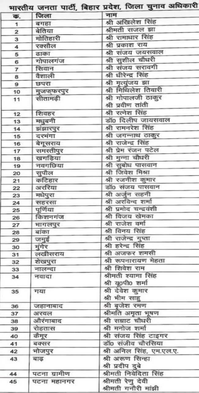 पार्टी सूत्रों से मिल रही जानकारी के अनुसार, बिहार भाजपा की ओर से संगठन चुनाव के लिए नियुक्त किए गए चुनाव अधिकारी सुरेश रूंगटा एवं सह चुनाव अधिकारी अनिल शर्मा ने जिला चुनाव अधिकारियों के नामों की घोषणा की है। इसकी सूची पार्टी के पदाधिकारियों व कार्यकर्ताओं के बीच जारी कर दी गई है।