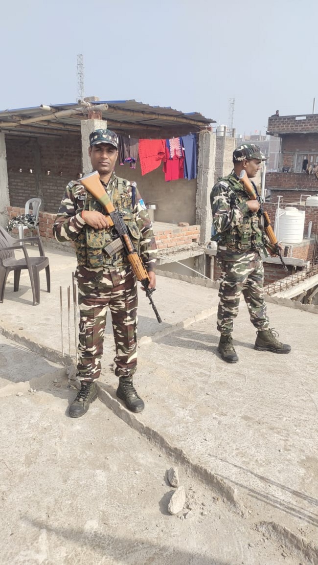 औरंगाबाद में सुरक्षा के लिए एक घर की छत पर तैनात पुलिसकर्मी।