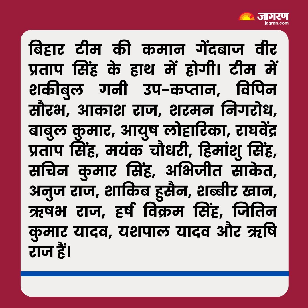 बिहार की टीम अपने चौथे मैच में मध्य प्रदेश से मोइनुल हक स्टेडियम में भिड़ेगी। अंतरराष्ट्रीय खिलाड़ी आवेश खान, वेंकटेश अय्यर, रजत पाटीदार बिहार के खिलाड़ियों के चुनौती देंगे। घर में बिहार का आखिरी मुकाबला उत्तर प्रदेश के साथ होगा। पटना में पहली बार रिंकू सिंह, भुवनेश्वर कुमार और नीतीश राणा जैसे खिलाड़ी गेंद और बल्ले से जौहर दिखाते नजर आएंगे।