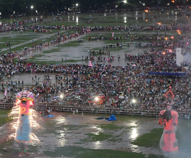 पटना के गांधी मैदान में बारिश के बीच रावण दहन का आयोजन किया गया। इस कार्यक्रम में राज्यपाल मुख्यमंत्री और दोनों डिप्टी सीएम शामिल हुए। बारिश के कारण रावण का सिर टूट गया था फिर भी 80 फीट के रावण के पुतले का दहन किया गया। मुख्यमंत्री नीतीश कुमार ने बिना सिर वाले रावण का वध किया।