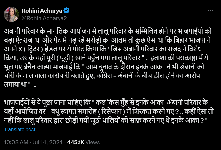 रोहिणी आचार्य ने लिखा, "अंबानी परिवार के मांगलिक आयोजन में लालू परिवार के सम्मिलित होने पर भाजपाइयों को बड़ा ऐतराज था और पेट में पड़ रहे मरोड़ों का आलम तो कुछ ऐसा था कि बिहार भाजपा ने अपने X (ट्विटर) हैंडल पर ये पोस्ट किया कि 'जिस अंबानी परिवार का राजद ने विरोध किया, उसके यहां पूरी (पूड़ी) खाने पहुंच गया लालू परिवार'