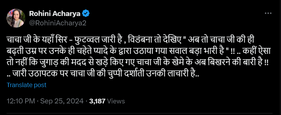 सारण लोकसभा सीट से राजद प्रत्याशी रहीं रोहिणी आचार्य ने एक्स हैंडल पर लिखा, "चाचा जी के यहां सिर-फुटव्वल जारी है, विडंबना तो देखिए "अब तो चाचा जी की ही बढ़ती उम्र पर उनके ही चहेते प्यादे के द्वारा उठाया गया सवाल बड़ा भारी है"!!.. कहीं ऐसा तो नहीं कि जुगाड़ की मदद से खड़े किए गए चाचा जी के खेमे की अब बिखरने की बारी है!! .. जारी उठापटक पर चाचा जी की चुप्पी दर्शाती उनकी लाचारी है.."