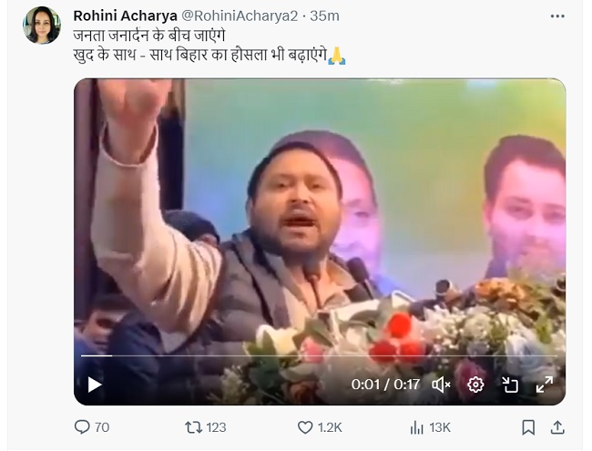 दरअसल, रोहिणी आचार्या ने रविवार सुबह अपने एक्स हैंडल पर एक के बाद एक कई पोस्ट साझा की हैं। इनमें उन्होंने तेजस्वी यादव की तारीफ करते हुए कहा है कि पूरा बिहार तेजस्वी के साथ है।