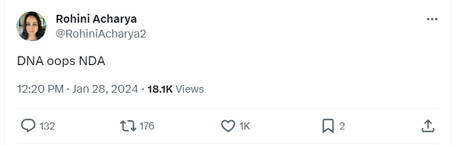 रोहिणी ने अपनी अगली पोस्ट में राजग पर निशाना साधा है। उन्होंने चौथी पोस्ट में लिखा DNA oops NDA। उन्होंने अपनी पोस्ट में कूड़ा, गिरगिट, सूरज जैसे शब्दों का इस्तेमाल किया।