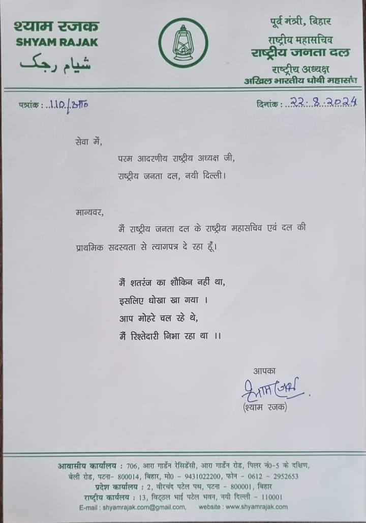राजद सुप्रीमो लालू यादव को बड़ा झटका लगा है। दिग्गज नेता श्याम रजक ने शायराना अंदाज में राजद से इस्तीफा दे दिया है। श्याम रजक ने इस्तीफा देते हुए लालू यादव को इमोशनल लेटर भी लिखा। श्याम रजक ने इस्तीफा देते हुए लिखा मैं राष्ट्रीय जनता दल के राष्ट्रीय महासचिव एवं दल की प्राथमिकता सदस्यता से त्यागपत्र दे रहा हूं। मैं शतरंज का शौकीन नहीं था इसलिए धोखा खा गया।