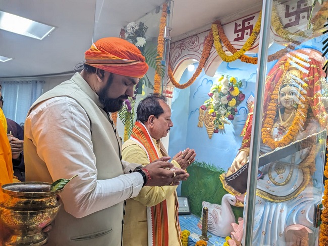 उन्होंने वैदिक विधि-विधान से विधान सभा लाइब्रेरी में लगी वीणा वादिनी की प्रतिमा के समक्ष पूजा की। साथ ही हवन एवं आरती भी की गई।