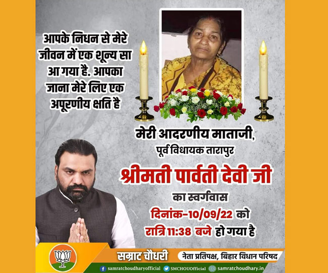 बिहार विधानसभा में नेता प्रतिपक्ष सम्राट चौधरी की मां पार्वती देवी का निधन, खुद भी विधायक रही थीं