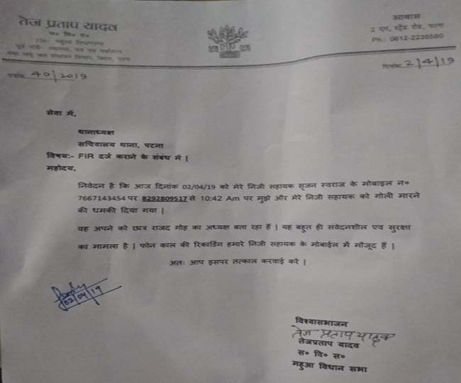 तेज प्रताप यादव ने बताया कि उनके निजी सचिव सृजन स्वराज के मोबाइल पर हत्या की धमकी दी गई है। धमकी देने वाले ने खुद को गोह का छात्र राजद अध्यक्ष बताया। इस संबंध में उन्होंने पटना के सचिवालय थाना में एफआइआर दर्ज करा दी है।