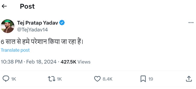 Bihar Politics बिहार में नीतीश कुमार के पाला बदलने के बाद जहां आरजेडी लोकसभा चुनाव में एनडीए सरकार को टक्कर देने के लिए अलग-अलग तरह की योजना बना रही है वहीं लालू के बड़े लाल तेजप्रताप के आज की एक पोस्ट ने कई सवाल खड़े कर दिए हैं। लालू के लाल ने ट्वीट कर कहा कि उन्हें 6 साल से परेशान किया जा रहा है।