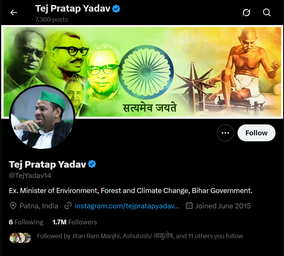 एक्स पर तेजप्रताप पहले 19 अकाउंट्स को फॉलो कर रहे थे। अब मात्र छह को ही फॉलो कर रहे हैं। पिता लालू प्रसाद, मां राबड़ी देवी, छोटे भाई तेजस्वी यादव, उत्तर प्रदेश के पूर्व मुख्यमंत्री अखिलेश यादव, अभिनेता रितेश देशमुख और टीम तेजप्रताप यादव को वे फॉलो कर रहे हैं।