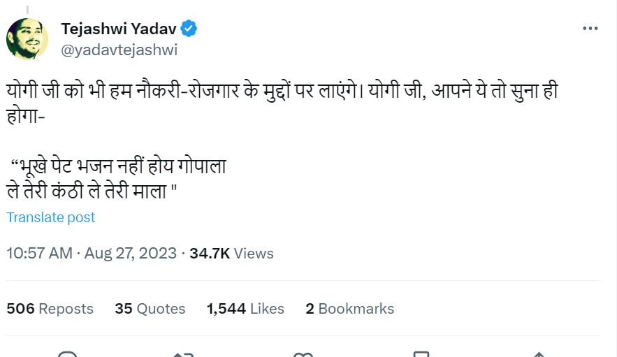 रविवार को एक ट्वीट में उन्होंने सीएम योगी पर हमला बोलते हुए लिखा, 'योगी जी, आपने ये तो सुना ही होगा। भूखे पेट भजन नहीं होय गोपाला, ले तेरी कंठी ले तेरी माला।' दरअसल, बिहार में 24 से 26 अगस्त तक शिक्षक भर्ती परीक्षा हुई थी। इसमें बिहार के लिए अलावा यूपी के भी परीक्षार्थियों ने भाग लिया था।