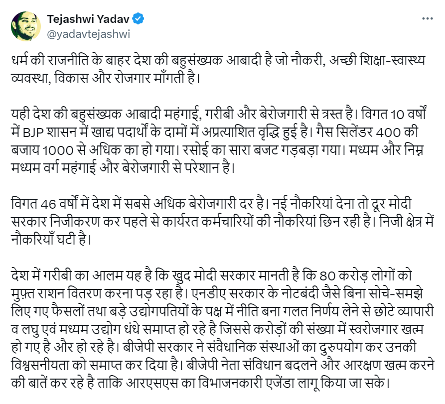 तेजस्वी यादव ने लिखा, धर्म की राजनीति के बाहर देश की बहुसंख्यक आबादी है जो नौकरी, अच्छी शिक्षा-स्वास्थ्य व्यवस्था, विकास और रोजगार मांगती है। यही देश की बहुसंख्यक आबादी महंगाई, गरीबी और बेरोजगारी से त्रस्त है। विगत 10 वर्षों में BJP शासन में खाद्य पदार्थों के दामों में अप्रत्याशित वृद्धि हुई है। गैस सिलेंडर 400 की बजाय 1000 से अधिक का हो गया। रसोई का सारा बजट गड़बड़ा गया। मध्यम और निम्न मध्यम वर्ग महंगाई और बेरोजगारी से परेशान है।