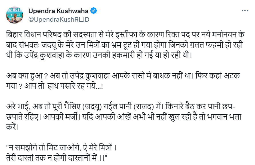 उन्होंने एक्स (ट्विटर) पर लिखा, "बिहार विधान परिषद की सदस्यता से मेरे इस्तीफा के कारण रिक्त पद पर नये मनोनयन के बाद संभवतः जदयू के मेरे उन मित्रों का भ्रम टूट ही गया होगा जिनको गलत फहमी हो रही थी कि उपेंद्र कुशवाहा के कारण उनकी हकमारी हो गई या हो रही थी।"