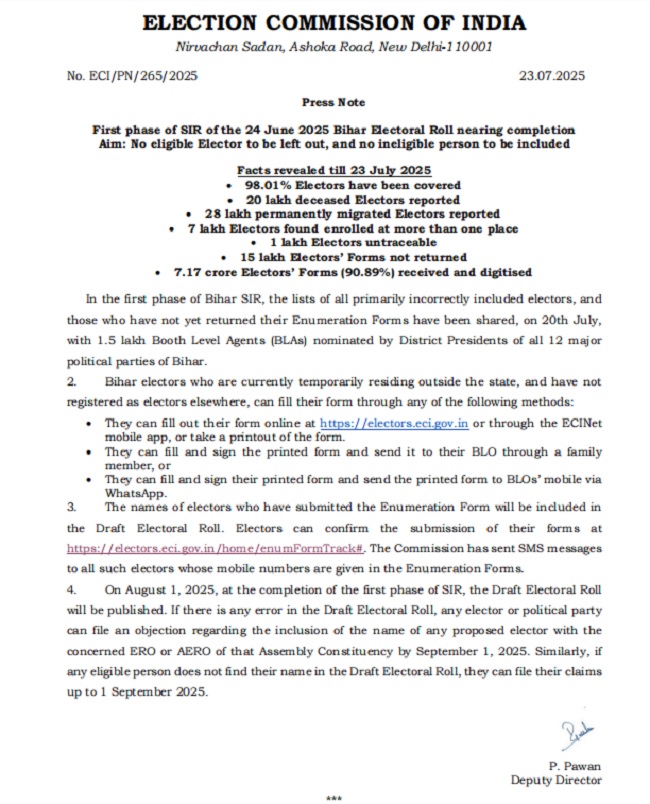 इस क्रम में चुनाव आयोग ने बुधवार को बिहार में मतदाता सूची को लेकर ताजा जानकारी साझा की है। अपने एक्स हैंडल पर आयोग ने एक पोस्ट में यह जानकारी दी है। आयोग ने इसमें खुलासा किया है कि 23 जुलाई तक अब तक 98.01 प्रतिशत मतदाताओं के नाम इस पुनरीक्षण प्रक्रिया में शामिल किए जा चुके हैं।