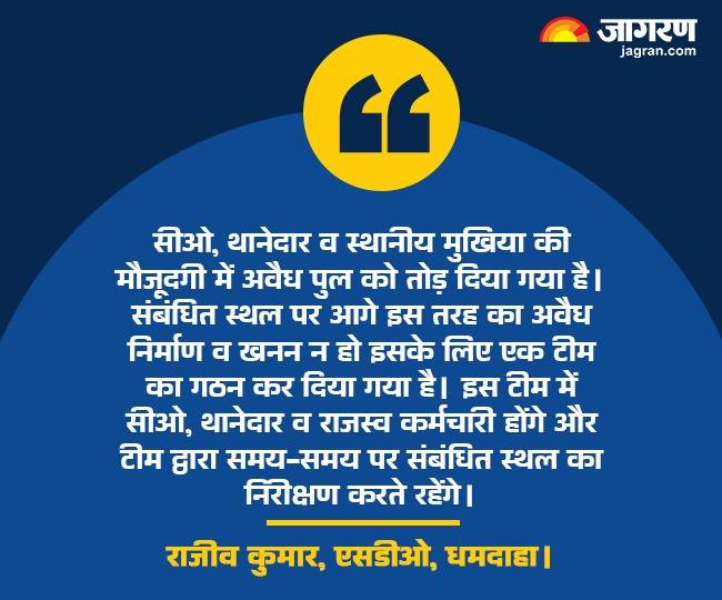 बाद में पुलिस बलों की मौजूदगी में उस पुल को जेसीबी की मदद से तोड़ा गया। एसडीओ ने बताया कि उक्त स्थल पर आगे भी इस तरह का अवैध खनन नहीं हो, इसकी निगरानी के लिए टीम का गठन भी कर दिया गया है।