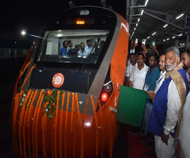 वंदे भारत ट्रेन को हरी झंडी दिखाते पूर्णिया के सांसद पप्पू यादव।