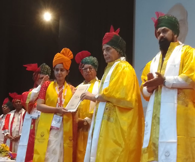 दीक्षांत समारोह में मेडिकल छात्रा को उपाधि प्रदान करते रक्षा मंत्री राजनाथ सिंह।