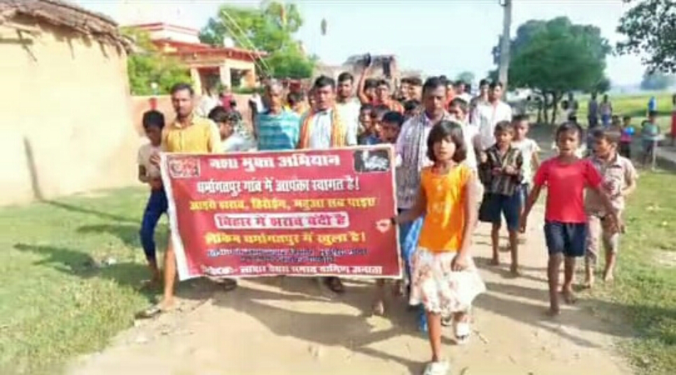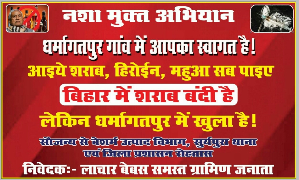 उसने गांव के बाहर एक बैनर टांग दिया है। इस पर लिखा है-‘नशा मुक्त अभियान : धर्मागतपुर गांव में आपका स्वागत है! आइए शराब, हेरोइन सब पाइए। बिहार में शराबबंदी है, लेकिन धर्मागतपुर गांव में खुला है। सौजन्य से उत्पाद विभाग, सूर्यपुरा थाना एवं जिला प्रशासन रोहतास। निवेदक : लाचार बेबस समस्त ग्रामीण जनता।’
