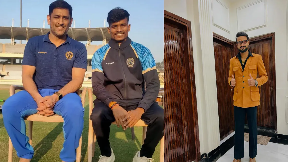 महेंद्र सिंंह धोनी के साथ अमित कुमार व अपने घर में आकाशदीप। जागरण