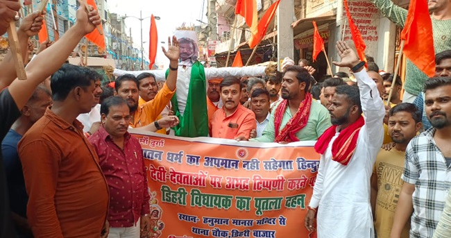 गुरुवार देर शाम को लोकल वॉट्सऐप ग्रुप में विधायक के एक बयान के वायरल होने के बाद हिंदूवादी संगठनों ने विरोध किया है। डेहरी बाजार स्थित हनुमान मानस मंदिर से लेकर कर्पूरी चौक तक बजरंग दल ने विरोध प्रदर्शन किया।