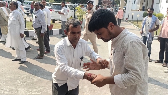 सर्किट हाउस के मुख्य गेट का शीशा टूटने के बाद घायल कार्यकर्ता। फोटो- जागरण