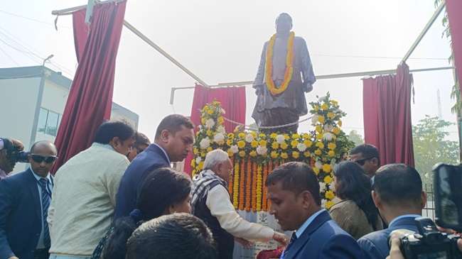 पंडित रघुनाथ झा की प्रतिमा का अनावरण करते सीएम नीतीश