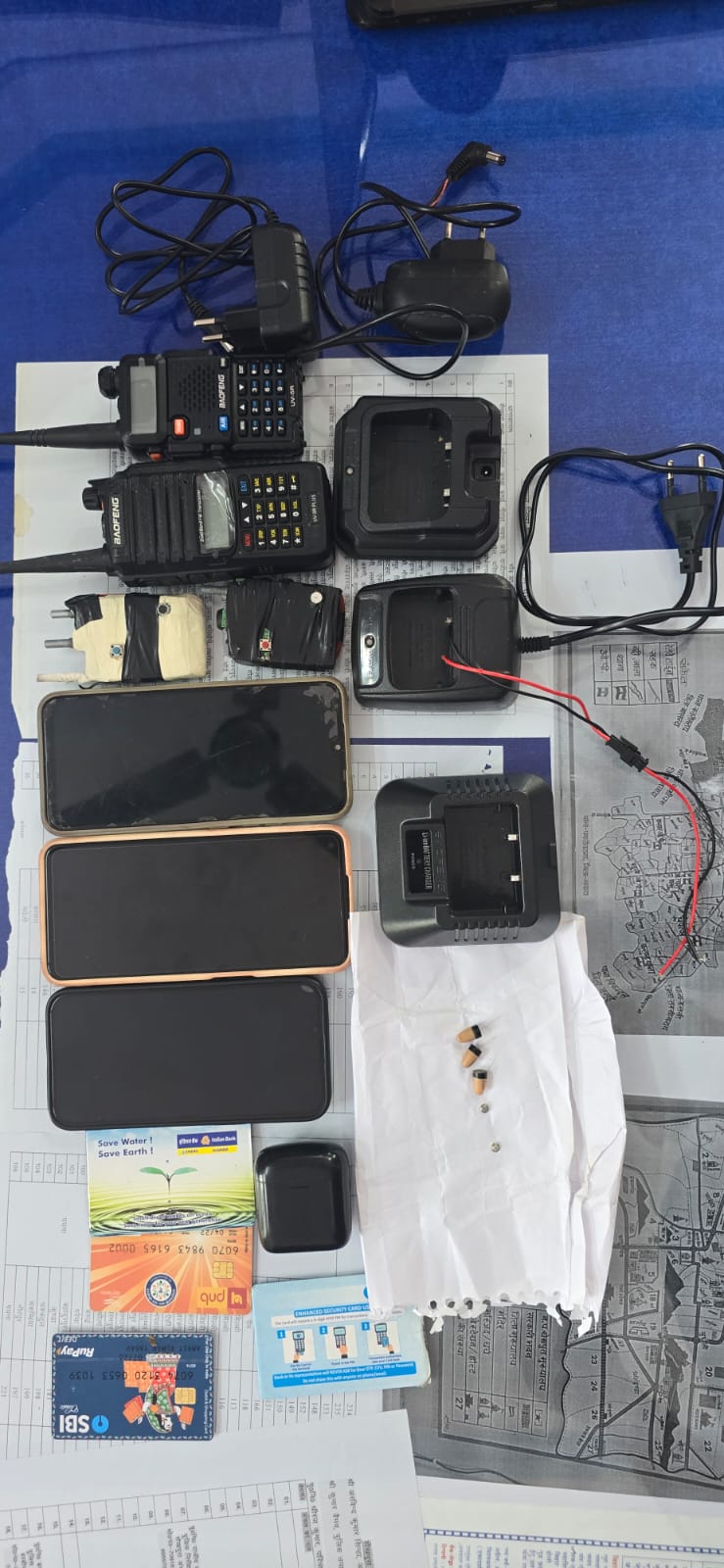 इनके पास से वॉकी टाकी, कई मोबाइल फोन,बटन बैटरी,ब्लू टूथ,आधार कार्ड,कई बैंकों के एटीएम सहित कुल 17 तरह की सामाग्री जब्त की गई है।