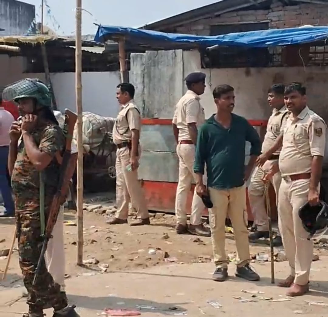 सीतामढ़ी में बेलसंड नगर के रजिस्ट्री चौक पर तैनात पुलिस बल