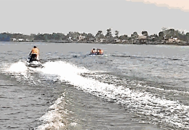 पश्चिम चंपारण के अमवा मन में वाटर स्पोर्ट्स का आनंद लेते पर्यटक।