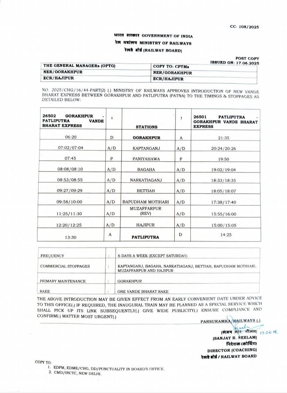 संवाद सहयोगी, बगहा। गोरखपुर से पटना तक वंदे भारत (Gorakhpur Patna Vande Bharat) का परिचालन 20 जून को शुरू हो सकता है। यह बगहा वासियों के लिए भी खुशखबरी है। दरअसल, एक पत्र सोशल मीडिया पर वायरल हो रहा है। पत्र को लेकर दावा किया जा रहा है को गोरखपुर-पटना वंदे भारत को बगहा में भी स्टॉपेज मिला है।