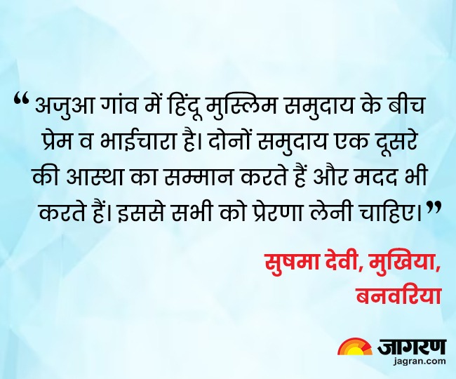समाज में सभी जाति और धर्म के लोगों को मिलकर रहना चाहिए। यहीं भारतीय संस्कृति है। अजुआ गांव के लोगों ने आपसी प्रेम की अद्भु़त मिसाल पेश की है। इससे अन्य पंचायतों को सीख लेनी चाहिए। - सतीश कुमार, प्रखंड विकास पदाधिकारी, नरकटियागंज