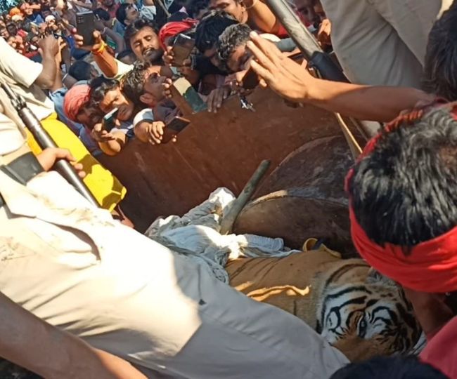 बेतिया, (पचं) जासं। मां-बेटे की हत्या करने के बाद आदमखोर बाघ गन्ने के खेत में जाकर छुप गया था। शनिवार की दोपहर में ड्रोन से निगरानी के दौरान गन्ने के खेत में दुबका हुआ बाघ दिखा तो बगहा के एसपी किरण कुमार गोरख जाधव के नेतृत्व में गठित आठ सदस्यीय टीम गजराज (मणिकंठा) के सहयोग से गन्ने के खेत में पहुंच गई। और आदमखोर बाघ को बगहा एसटीएफ के चंदन और बेतिया जिला पुलिस ने कुंदन कुमार और बगहा पुलिस जिला के गौतम कुमार ने ढेर कर दिया।