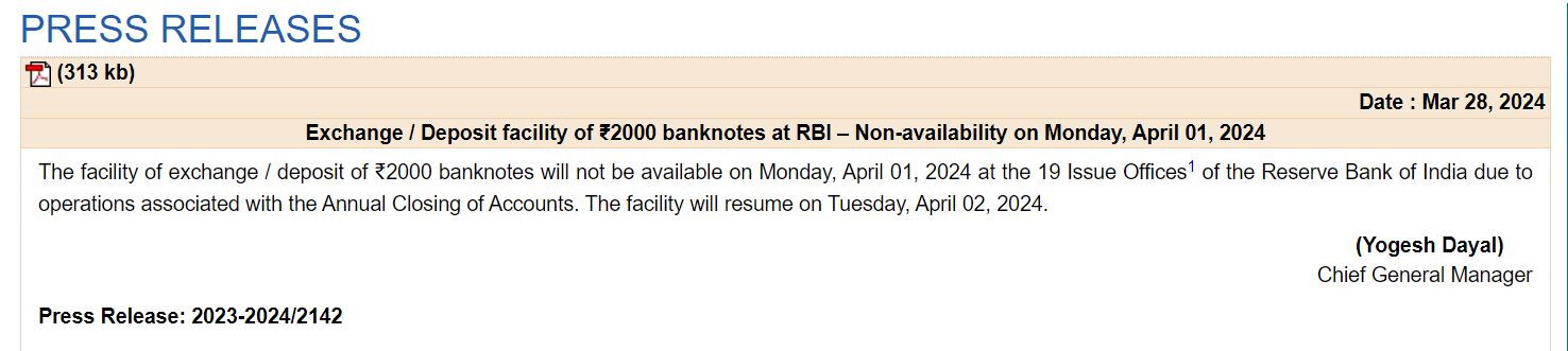 आरबीआई के प्रेस रिलीज के अनुसार वार्षिक लेखाबंदी से जुड़े कार्यों की वजह से 1 अप्रैल 2024 को आम जनता को 2,000 रुपये नोट एक्सचेंज की सुविधा नहीं मिलेगी।