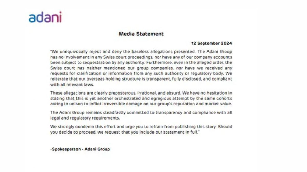अदाणी ग्रुप ने मीडिया से कहा है कि अगर आप खबर छापें तो हमारे बयान तो जरूर शामिल करें। कंपनी ने साफ कहा है कि उनका संबंधि स्विस कोर्ट के किसी कार्यवाही से नहीं है। इसके अलावा कंपनी ने यह भी साफ कहा कि उनके किसी भी स्विस अकाउंट को फ्रीज नहीं किया गया है।