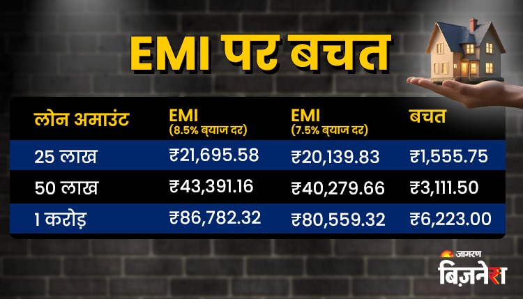 1 करोड़ रुपये अगर 20 साल के लिए 8.5 फीसदी के हिसाब से लोन पर लिए जाए, तो हर महीने अभी 86,782.32 रुपये ईएमआई देनी होगी। जो 7.5 फीसदी के अनुसार 80,559.32 रुपये प्रति माह ईएमआई रह जाएगी। इसमें कुल हर महीने 6,223.00 रुपये की बचत होगी।