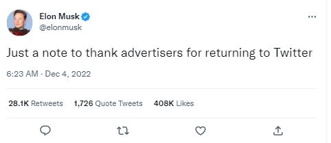 Elon Musk की ओर से ट्विटर के अधिग्रहण के बाद बड़ी कंपनियों द्वारा प्लेटफार्म पर विज्ञापन रोक दिया गया था। अब फिर से इन कंपनियों की ओर से ट्विटर पर विज्ञापन शुरू करने का फैसला लिया गया है।