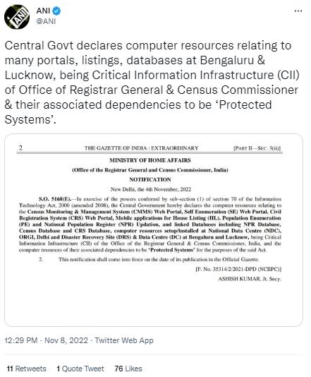 4 नवंबर को केंद्र सरकार की ओर से जारी किए गए नोटिफिकेशन में बताया गया है कि केंद्र सरकार ने सेंसस मॉनिटरिंग एंड मैनेजमेंट सिस्टम (CMMS) वेब पोर्टल, सेल्फ एनुमरेशन (SE) वेब पोर्टल, सिविल रजिस्ट्रेशन सिस्टम (CRS) वेब पोर्टल, मोबाइल एप्लीकेशन फॉर हाउस लिस्टिंग (HL), पापुलेशन एनुमरेशन (PE), नेशनल पापुलेशन रजिस्टर (NPR) अपडेटेशन और उससे जुड़े एनपीआर के डाटाबेस, सेंसस डाटाबेस, सीआरएस डाटाबेस, नेशनल डाटा सेंटर में मौजूदा कंप्यूटर रिसोर्सेज सेटअप, ओआरजीआई दिल्ली, डिजास्टर रिकवरी साइट (DRS) और बेंगलुरु और लखनऊ में मौजूद डाटा सेंटर (DC) को संरक्षित सिस्टम घोषित कर दिया है।
