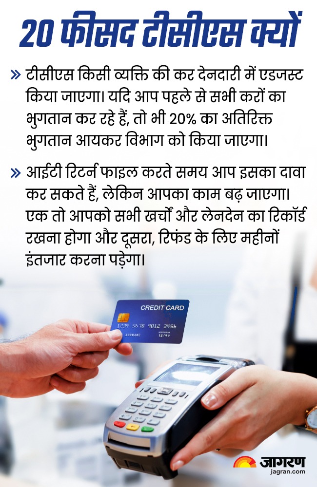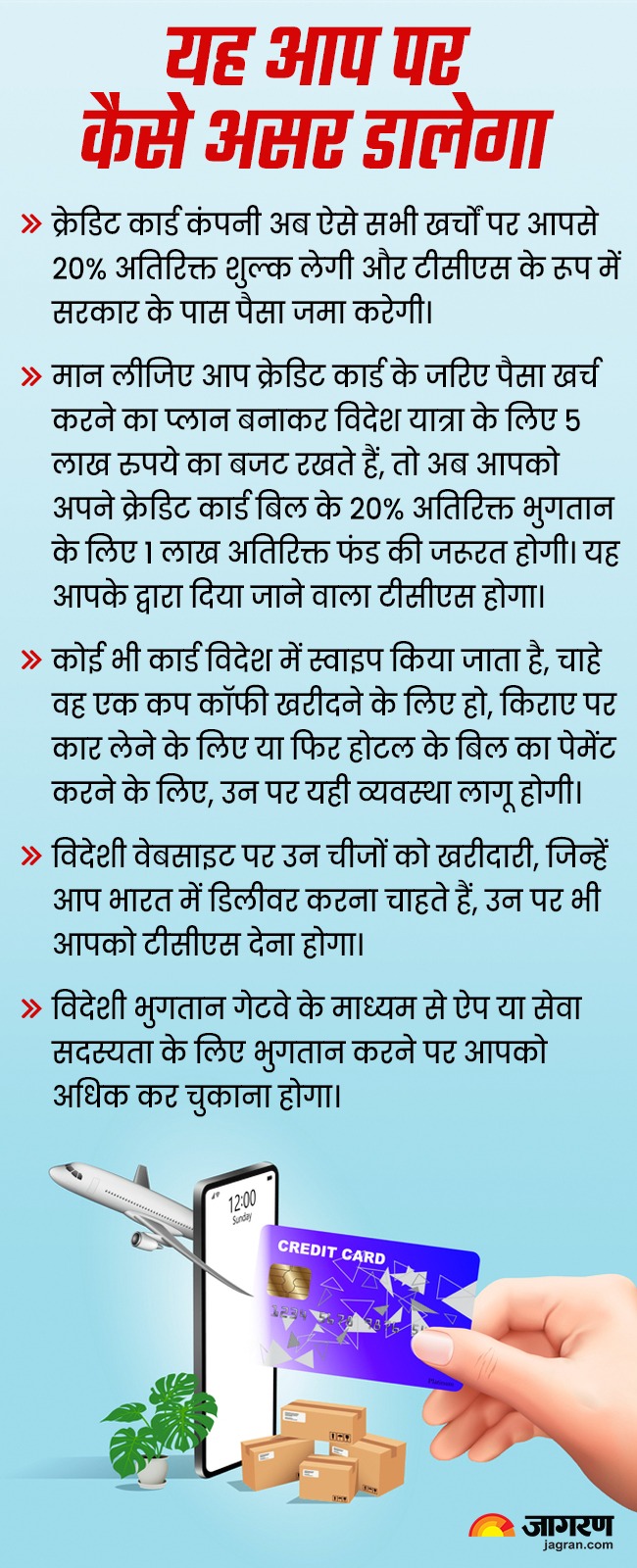 अंतरराष्ट्रीय क्रेडिट कार्ड को एलआरएस के दायरे में लाने और क्रेडिट कार्ड से विदेश में किए जाने वाले खर्च पर 20 प्रतिशत टीसीएस लगाने से विदेश यात्रा महंगी हो सकती है। मान लीजिए, विदेश यात्रा के दौरान होटल बुकिंग व अन्य पैकेज पर किसी ने दो लाख रुपये का भुगतान क्रेडिट कार्ड से किया तो एक जुलाई से उसे इतने अमाउंट पर 40,000 रुपये टीसीएस का देना होगा। 30 जून तक उसे दो लाख रुपये देने होंगे, लेकिन एक जुलाई से 2.40 लाख रुपये का भुगतान करना होगा।