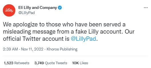 बता दें, बीते गुरुवार को अमेरिकन फार्मा कंपनी एली लिली (LLY) के नाम से एक ब्लू टिक वेरिफाइड फर्जी अकाउंट ने ट्वीट किया गया कि कंपनी के द्वारा बेची जाने वाली इन्सुलिन अब लोगों को फ्री में मिलेगी। इस फर्जी ट्वीट के बाद कंपनी का शेयर प्राइस एक ही दिन में 4.37 प्रतिशत तक गिर गया, जिससे कंपनी का बाजार मूल्यांकन 15 बिलियन डॉलर तक गिर गया।