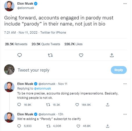 वहीं, आज मस्क ने भी ट्वीट करके कहा कि अगर किसी प्रसिद्ध संस्था या फिर व्यक्ति के नाम से पैरोडी (Parody) अकाउंट है, तो फिर उस खाताधारक को बायो के साथ- साथ अपने नाम में भी पैरोडी लगाना होगा।