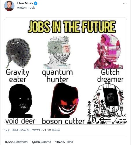 मस्क की ओर से किए गए एक ट्वीट में कहा गया कि भविष्य में Gravity Eater, Quantum Hunter,Glitch Dreamer,Void Deer और Boson Cutter जैसी जॉब्स आएंगी। इस ट्वीट को अब तक 1.15 लाख से अधिक लाइक्स और 9500 से अधिक रीट्वीट मिल चुके हैं।