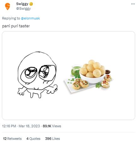 एलन मस्क के इस ट्वीट पर फूड डिलीवरी प्लेटफॉर्म स्विगी का जवाब काफी मजेदार रहा है। स्विगी ने मस्क के ट्वीट के जवाब में एक फोटो ट्वीट की, जिसके कैप्शन में लिखा था कि पानी पूरी टेस्टर लिखा था और फोटो में पानी पूरी के साथ एक कार्टून था। स्विगी की ओर से दिए गए इस रिप्लाई को अब तक 396 लाइक्स और 12 रीट्वीट मिल चुके हैं।