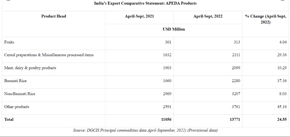 व्यापार व उद्योग मंत्रालय ने मौजूदा वित्त वर्ष की दूसरी तिमाही में कृषि तथा प्रोसेस्ड फूड उत्पादों के निर्यात में 25 फीसद बढ़त की जानकारी दी है। पिछले साल इसी अवधि की तुलना में मौजूदा वित्त वर्ष 2022-23 की दूसरी तिमाही में यह 13771 मिलियन डालर तक पहुंच गया।