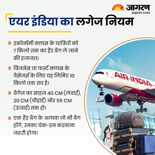एयर इंडिया के यात्री प्रीमियम इकोनॉमी और इकोनॉमी क्लास में 7 किलोग्राम तक वजन वाला हैंड बैग ले जा सकते हैं। इसका डायमेंशन 115 सेंटीमीटर (लंबाई + चौड़ाई + ऊंचाई) अधिक नहीं होना चाहिए। वहीं, फर्स्ट क्लास और बिजनेस क्लास के पैसेंजर्स 10 किलोग्राम तक का बैग ले जा सकते हैं। प्रत्येक यात्री केबिन बैगेज के अलावा लैपटॉप बैग या लेडीज पर्स भी ले जा सकता है। बशर्ते वह सीट के नीचे समा सके और उसका वजन 3 किलोग्राम से अधिक न हो।