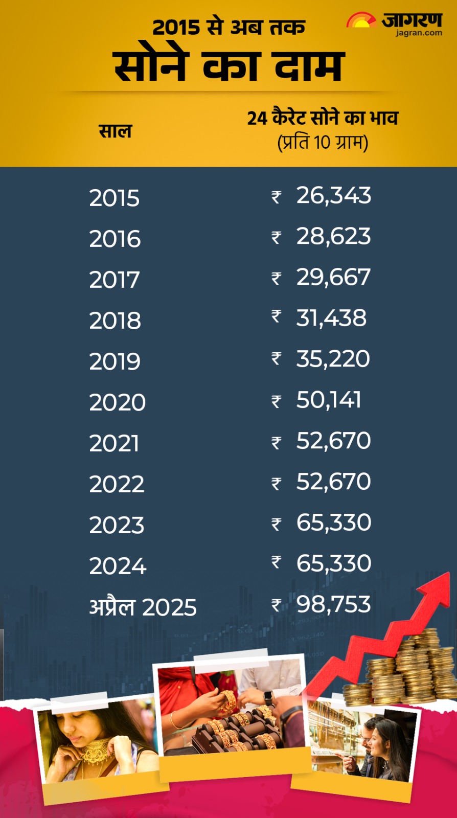 22 अप्रैल मंगलवार को 24 कैरेट सोने की कीमत 1 लाख रुपये प्रति 10 ग्राम पहुंच गई है। ये कीमत टैक्स सहित है। पिछले कुछ दिनों से सोने के दाम में लगातार इजाफा जारी है। जिसका कारण चीन और अमेरिका के बीच चल रहे विवाद को बताया जा रहा है। आज हम जानेंगे कि पिछले 10 साल यानी 2015 से 2025 तक सोने के दाम में कितना इजाफा आया है।