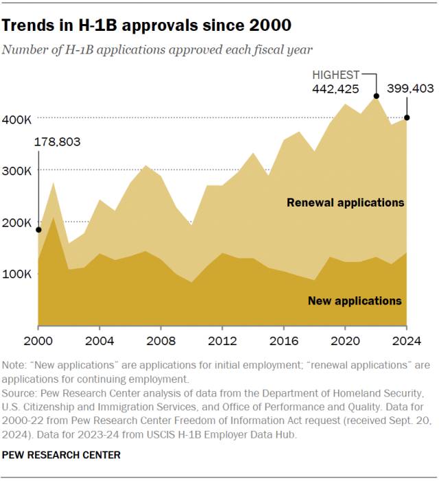 प्यू रिसर्च के अनुसार 2024 में उच्च-कुशल विदेशी कर्मचारियों के लिए लगभग 400,000 H-1B आवेदन स्वीकृत किए गए। यह वित्त वर्ष 2000 में स्वीकृत आवेदनों की संख्या के दोगुने से भी अधिक है। स्वीकृतियों की संख्या 2022 में चरम पर थी, जब 442,425 आवेदन स्वीकृत किए गए थे।