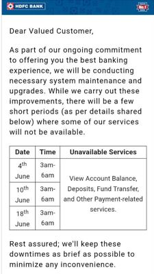 एचडीएफसी बैंक की ओर से ग्राहकों को भेजे गए मेल में लिखा गया कि हम अपने ग्राहकों को अच्छी बैंकिंग सेवाएं उपलब्ध कराने के लिए प्रतिबद्ध हैं। हम अपने सिस्टम के रखरखाव और अपग्रेड करने के लिए थोड़े समय के लिए अपनी कुछ सेवाओं को बंद रखेंगे।