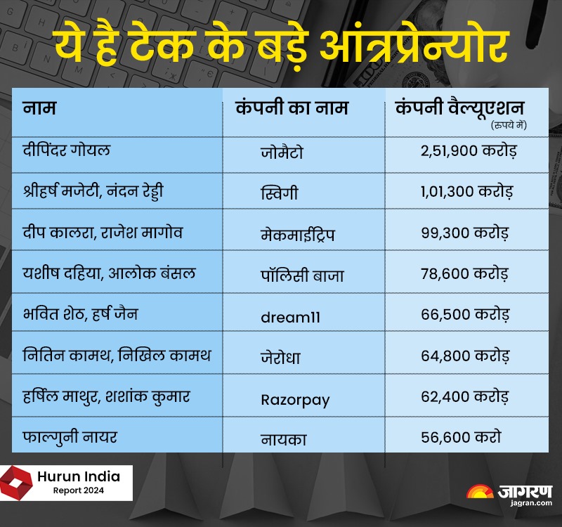 Hurun India Report 2024 हुरुन इंडिया ने देश के टॉप आंत्रप्रेन्योर की लिस्ट शेयर की है। इस लिस्ट में सेल्फ-मेड आंत्रप्रेन्योर (Self-Made Entrepreneurs) में से 8 टेक सेक्टर से हैं। इन सभी आंत्रप्रेन्योर ने रिस्क के साथ खुद का स्टार्टअप शुरू किया है। आज के समय में इनकी कंपनी की वैल्यूएशन करोड़ों रुपये में है। आइए इस आर्टिकल में विस्तार से जानते हैं।