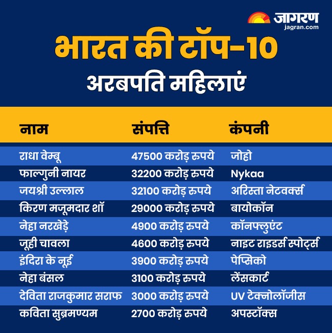 - भारतीय महिलाएं अरबपतियों की लिस्ट में दूसरे स्थान पर ब्यूटी ब्रांड Nykaa की सीईओ फाल्गुनी नायर हैं। इनकी नेट वर्थ 32200 करोड़ रुपये है।