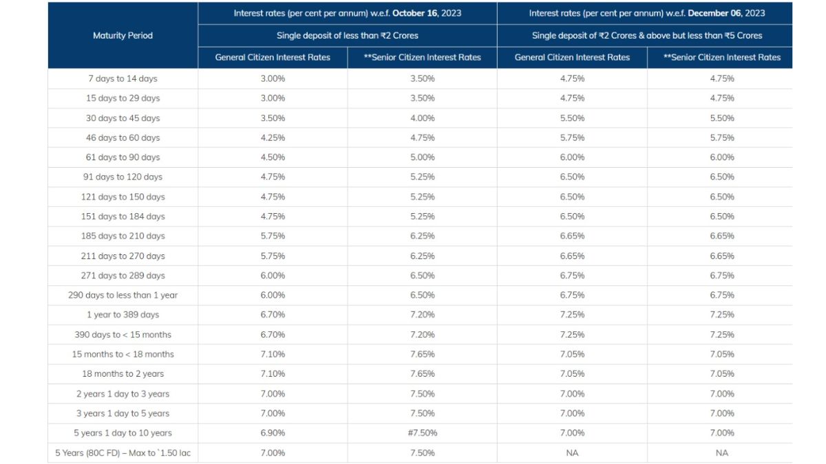 - 21 महीने -2 साल की एफडी पर सभी नागरिकों के लिए सबसे कम ब्याज की दर 5 फीसदी और सबसे ज्यादा ब्याज दर 7.05 फीसदी रहेगी।